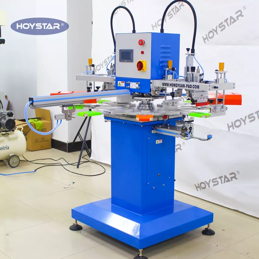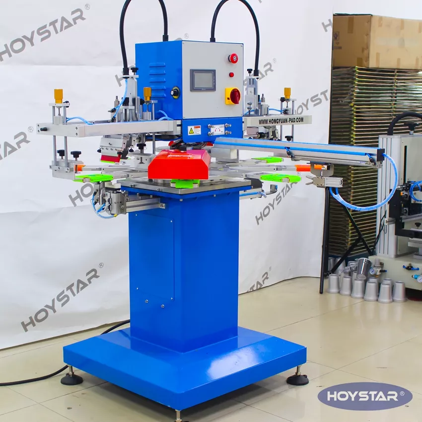 HOYSTAR on luotettava valmistaja ja toimittaja Kiinassa; Tämä HOYSTAR 2 Color Automaattinen Can Cooler Koozies -silkkipainokone Soveltuu elintarvike- ja pakkausteollisuudelle, on erikoistunut koozies- ja tölkinjäähdyttimiin. Tämä automaattinen silkkipainokone automatisoi saumattomasti koko kaksipuolisen tulostusprosessin. Lataamisesta tulostamiseen, kuivaamiseen, 180 asteen kiertoon, toiselle puolelle tulostamiseen ja lopulliseen purkamiseen