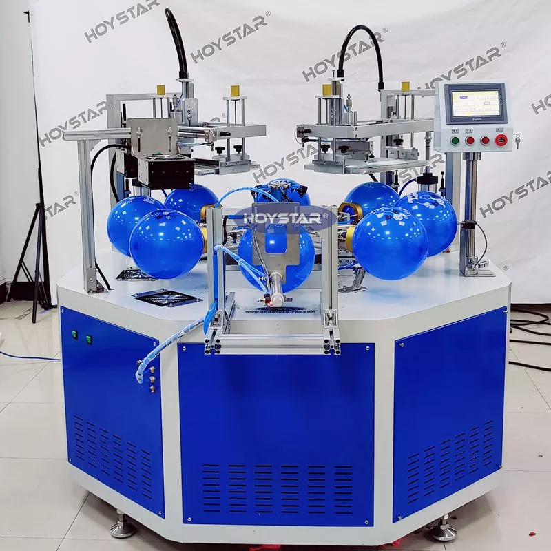 Ammattimaisena valmistajana ja toimittajana HOYSTAR Automatic 2 Color Balloons -silkkipainokone on suunniteltu tulostamiseen lateksiilmapalloille. Varustettu pyörivällä työpöydällä, automaattinen puhallus, automaattinen pyöritys, automaattinen kuivaus, automaattinen purkutoiminto. PLC-kosketusnäytön ohjaus, käyttäjäystävällinen käyttöliittymä turvalliseen ja intuitiiviseen käyttöön. Koneessa yhdistyvät nopeus, tarkkuus ja helppokäyttöisyys.