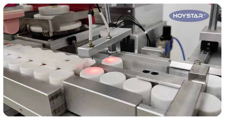 Koneessa on liekkikäsittelyjärjestelmä, joka parantaa musteen tarttumista pullonkorkkien pinnoille ja parantaa tulostuksen kestävyyttä.